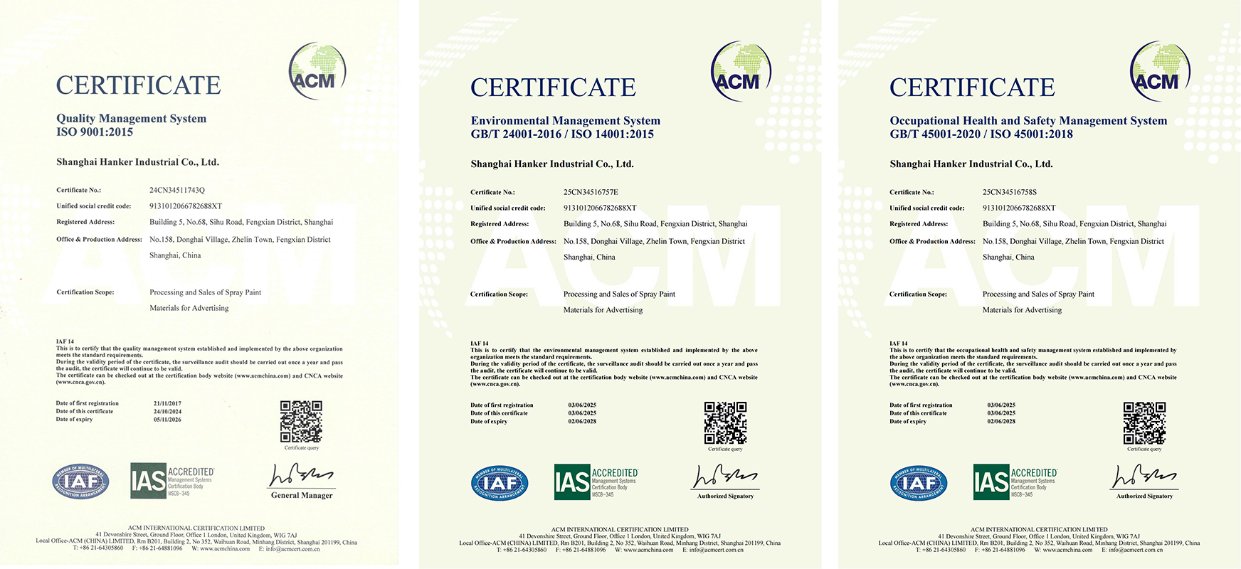 Récemment, Shanghai Hanker Industrial Co., Ltd. (appelé "Hanker") a obtenu avec succès la certification du système de gestion de la qualité ISO 9001: 2015, la certification ISO 14001 Environmental Management System et la certification ISO 45001 Système de gestion de la santé et de la sécurité au travail par le système de certification ACM International Limited. Cette réalisation démontre que l'entreprise a pleinement respecté les normes internationales dans le contrôle de la qualité, la protection de l'environnement et la sécurité des employés. L'acquisition de ces trois certifications de système est le résultat de l'engagement à long terme de Hanker envers la gestion standardisée. En optimisant les processus de production, en établissant des mécanismes de prévention des risques et de contrôle environnementaux et d'amélioration des systèmes de formation en santé et sécurité au travail, la société a obtenu un contrôle standardisé sur toute la chaîne, de l'achat de matières premières à la livraison de produits finis. À l'avenir, en prenant ces certifications en tant que fondation, Hanker approfondira l'innovation technologique et la mise à niveau de la gestion, promouvra activement la coopération de la recherche de l'industrie-université avec les universités, explore les applications de pointe dans le domaine des matériaux et contribue au développement de haute qualité de l'industrie.